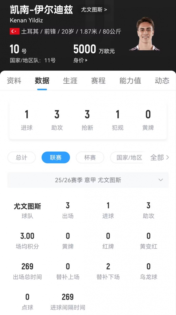 现年20岁的伊尔迪兹本赛季已经为尤文在联赛出场3次贡献1球3助,他的德转身价已经来到了5000万欧元。
